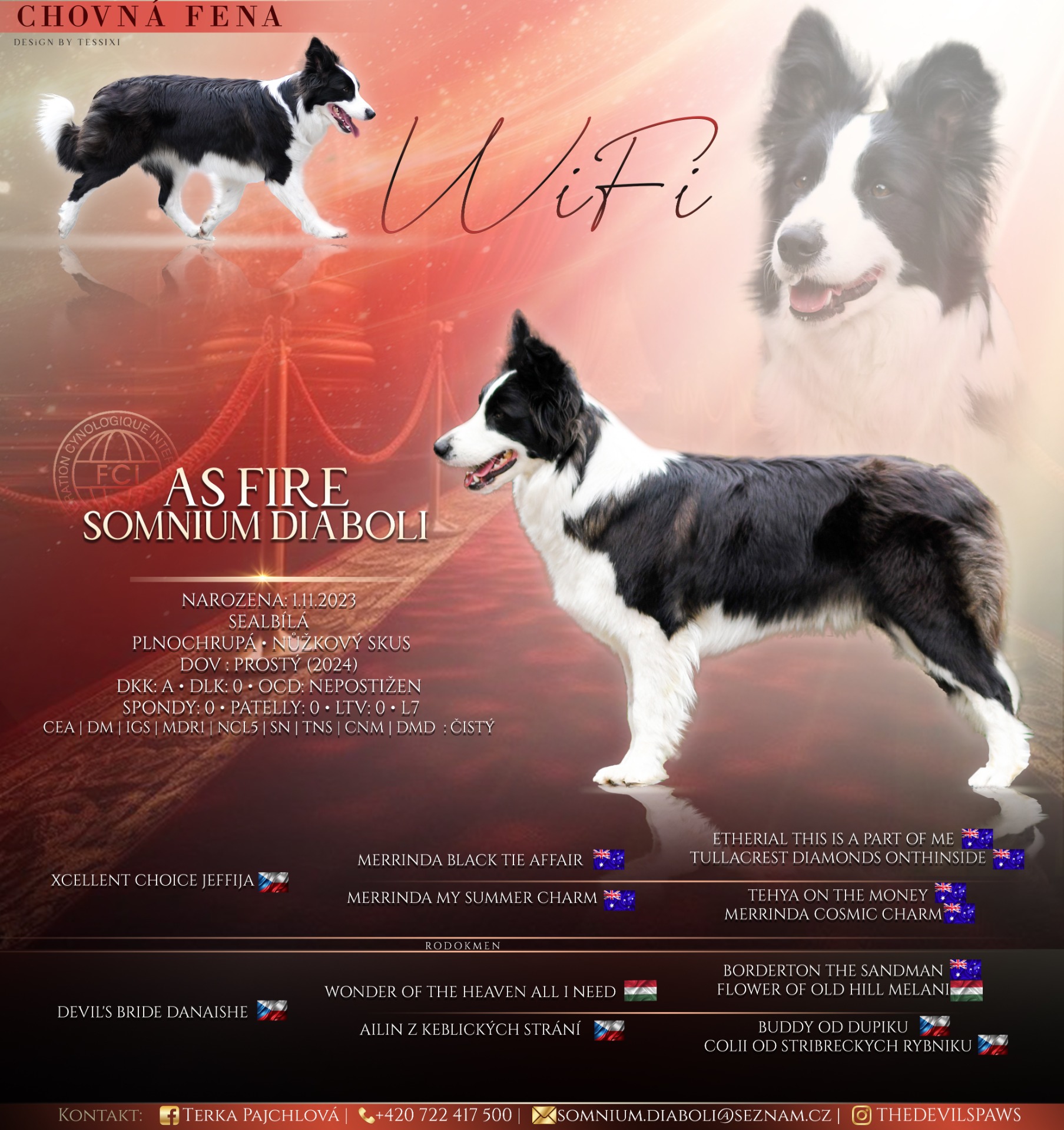 Wifi je neplánovaný přírustek a láska na první pohled hned po porodu , je užásná . Vyrovnaná fena,má drive i will to please. Rušná prostředí nejsou pro ní probém už od štěňátka a dokáže se v nich krásně soustředit .